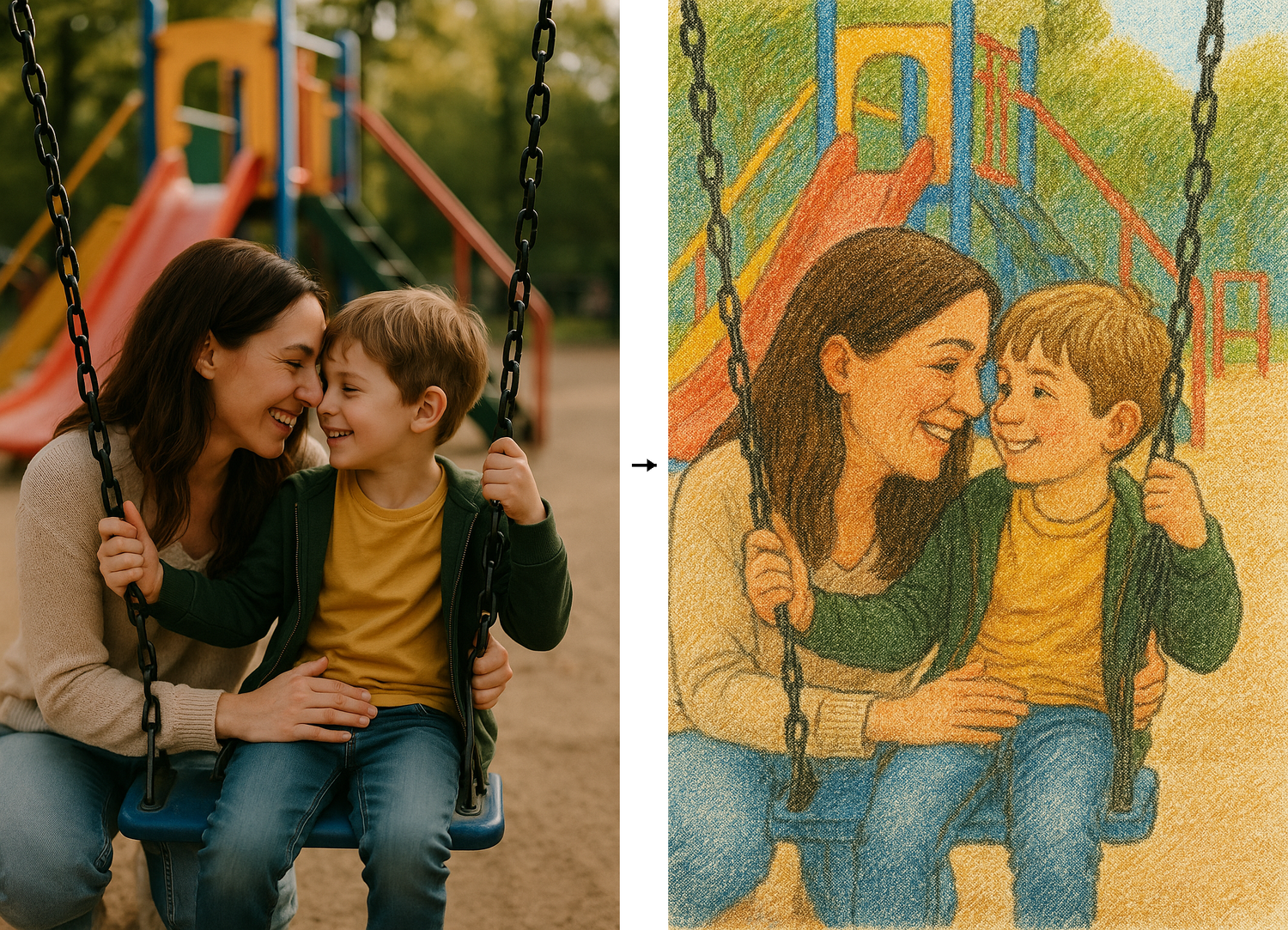 In deze stijl wordt jouw herinnering omgetoverd tot een kunstwerk alsof het met liefde is getekend door een kind. Met vrolijke kleuren, krullerige lijntjes en een tikje imperfectie, krijg je een beeld dat voelt als puur geluk.