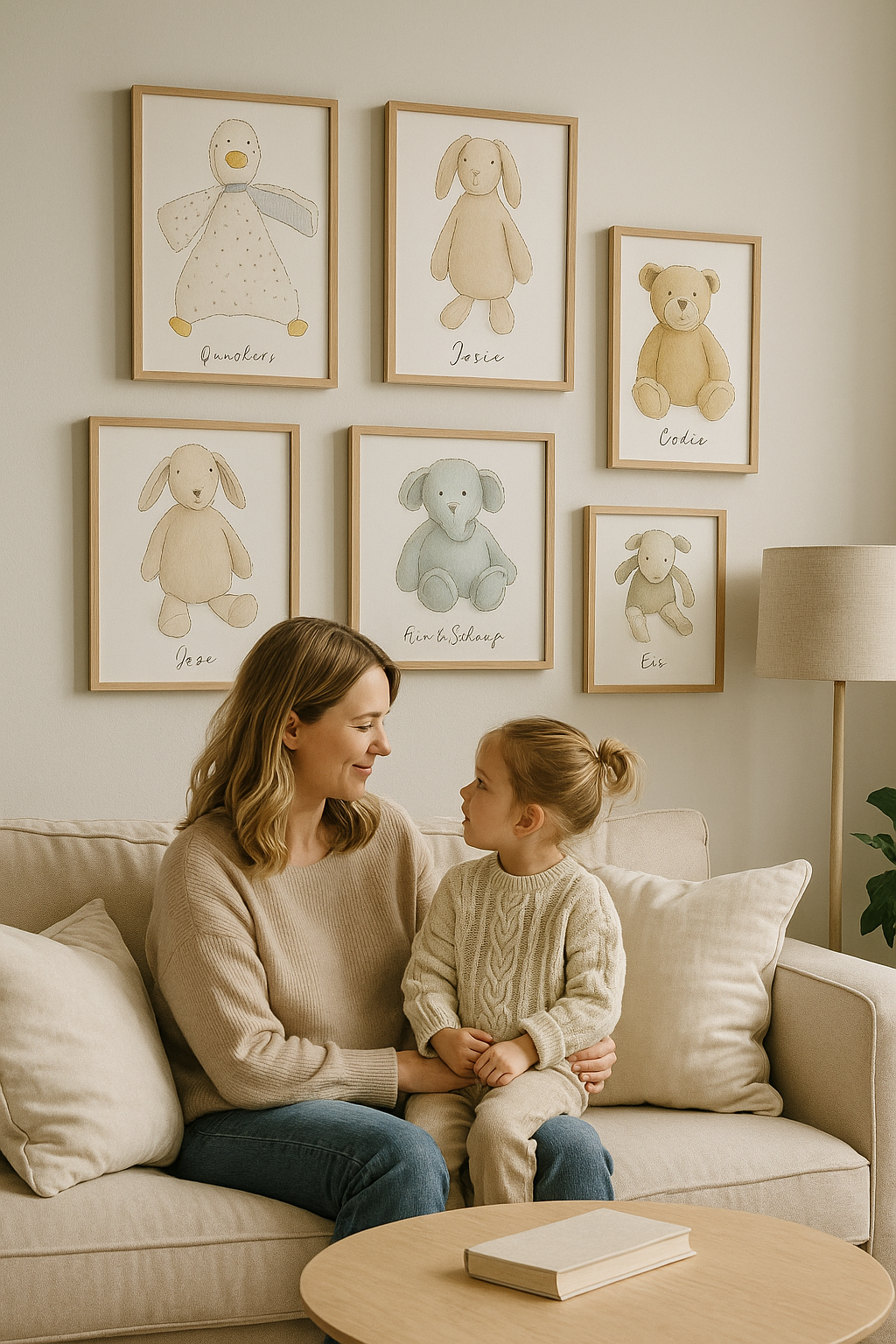 Met zorg tekenen we jouw knuffel na in een minimalistische stijl die past in iedere kamer. Lief, tijdloos en uniek — net als de band tussen kind en knuffel.